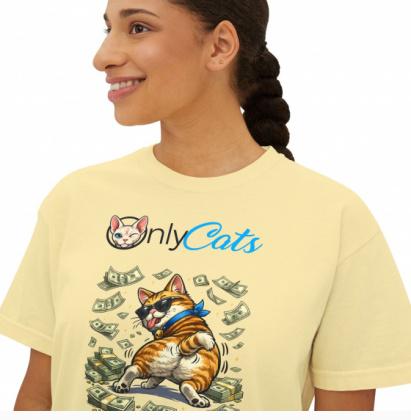 S M L XL 2XL Width, in 18.25 20.25 22.00 24.00 26.00 Length, in 20.00 21.00 22.00 23.00 24.00 Sleeve length from center back, in 15.62 16.50 17.37 18.37 19.25 This boxy tee brings playful cat energy to your everyday wardrobe. A relaxed, slightly cropped silhouette gives a casual, confident look that layers easily or stands on its own. The front features a colorful illustration of a mischievous cat surrounded by fluttering bills and the whimsical "Only Cats" mark, adding humor and personality to a simple white canvas. The heavy, ring-spun cotton holds prints well and develops a lived-in feel over time thanks to pigment-dyed shades. Wear it around the house while sipping morning coffee, out running quick errands, or at low-key hangouts with fellow cat lovers its a comfortable, expressive piece that celebrates feline flair without trying too hard.Product features- 100% ring-spun cotton for a soft, durable print surface- Shoulder-to-shoulder twill tape to prevent stretching- Boxy, slightly cropped fit for a relaxed, modern silhouette- Pigment-dyed fabric for a vintage, lived-in color effect- Heavy 6.1 oz fabric with sewn-in twill label and DTF/DTG neck printCare instructions- Machine wash: cold (max 30C or 90F)- Non-chlorine: bleach as needed- Tumble dry: low heat- Iron, steam or dry: low heat- Do not drycleanEU representative: HONSON VENTURES LIMITED, [email protected], 3, Gnaftis House flat 102, Limassol, Mesa Geitonia, 4003, CY Product information: Comfort ColorsĀ® 3023CL, 2 year warranty in EU and Northern Ireland as per Directive 1999/44/EC Care instructions: Machine wash: cold (max 30C or 90F), Non-chlorine: bleach as needed, Tumble dry: low heat, Iron, steam or dry: low heat, Do not dryclean