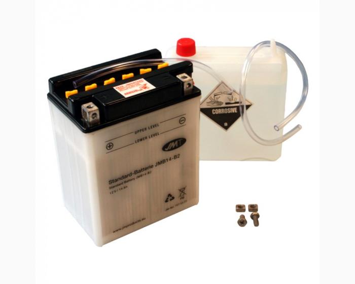 JMT Motorrad-Batterie High Power - High Power Starterbatterie in bewährter und zuverlässiger Markenqualität. - erhöhte Kaltstartleistung gegenüber Standardbatterien - trocken ungefüllt - diese Starterbatterie beinhaltet Schrauben, Entlüftungsschlauch sowie Säurepack in entsprechender Menge für die Erstbefüllung. Baugleich mit: Yuasa Herstellernummer YB14-B2 Varta Herstellernummer 51414 GS Herstellernummer CB14-B2 Preiseinheit: 1 Stück für Honda XRV 750 Africa Twin RD04 1990-1992 Technische Daten: Spannung :   12v Kapazität :   14 Ah (10 Std) Ausführung :   Standard Kälteprüfstrom laut Hersteller :   160 A Kälteprüfstrom in (SAE) gemessen mit JJM 609.00.66 :   245 A Kälteprüfstrom in (DIN) gemessen mit JJM 609.00.66 :   225 A Kälteprüfstrom in (EN) gemessen mit JJM 609.00.66 :   135 A Länge :   134 mm Breite :   89 mm Höhe :   164 mm Gewicht betriebsbereit :   4.43 kg Säurepack inkl. :   Ja Säurevolumen :   0.87 L Anschlusstyp :   von vorne     von oben Pluspol :   vorne links Minuspol :   vorne rechts Gasableitung :   rechts Hersteller :   JMT