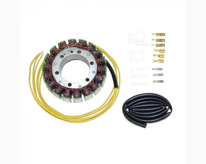 Lichtmaschinenstator Um eine optimale Leistung des Lichtmaschinenstators zu gewährleisten, wurden umfangreiche Tests durchgeführt und mit Fahrern aus aller Welt eng zusammengearbeitet. Ein vollständiger Kabelbaum und OE Stecker ermöglichen eine einfache Installation des Stators. Der Stator ist so konstruiert, dass Er nicht nur den OE und Kunden Anforderungen entspricht, sondern aufgrund spezieller Verbesserungen (mehr Wicklungen der Spulen, Drahtgröße, Anzahl der Windungen) sogar übertrifft. Mehr Wicklungen führen beispielsweise zu einem geringeren Widerstand, was wiederum zu einer höheren Leistung führt bei geringerer Wärmeentwicklung. - Hochwertige Spulen, Gummidichtungen und Steckverbinder - Einfache Installation - 3-Phasen-Stator - Ausgangsleistung: 320W, 4.500 rpm (Kann aufgrund von der Konfiguration und des Zustandes des Ladesystem +/- 5% variieren) Preiseinheit: 1 Stück für Honda XRV 750 Africa Twin RD04 1990-1992