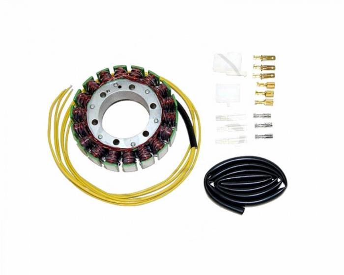 Lichtmaschinenstator Um eine optimale Leistung des Lichtmaschinenstators zu gewährleisten, wurden umfangreiche Tests durchgeführt und mit Fahrern aus aller Welt eng zusammengearbeitet. Ein vollständiger Kabelbaum und OE Stecker ermöglichen eine einfache Installation des Stators.  Der Stator ist so konstruiert, dass Er nicht nur den OE und Kunden Anforderungen entspricht, sondern aufgrund spezieller Verbesserungen (mehr Wicklungen der Spulen, Drahtgröße, Anzahl der Windungen) sogar übertrifft. Mehr Wicklungen führen beispielsweise zu einem geringeren Widerstand, was wiederum zu einer höheren Leistung führt bei geringerer Wärmeentwicklung. - Hochwertige Spulen, Gummidichtungen und Steckverbinder - Einfache Installation - 3-Phasen-Stator - Ausgangsleistung: 320W, 4.500 rpm (Kann aufgrund von der Konfiguration und des Zustandes des Ladesystem +/- 5% variieren) Preiseinheit: 1 Stück für Honda XRV 750 Africa Twin RD07 1993-2000
