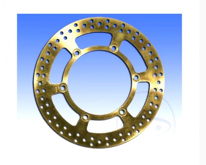 EBC MX Bremsscheibe für Offroad Motorräder. MADE IN UK. Ziel bei der Entwicklung ist die Verbesserung des Bremsverhaltens gegenüber der Originalbremsscheibe. EBC verwendet HPSR Stahl mit einem niedrigen Kohlenstoffgehalt, der einen um 18% höheren Reibbeiwert besitzt. Dieser Stahl ist wesentlich widerstandsfähiger gegen Rost als Gussstahl. Zusätzlich ist die gesamte Oberfläche mit einer 3 Mikron dicken Zinkschicht geschützt, die sich im Bereich der Bremsbelagkontaktzone schon beim Einbremsen abschleift. Lediglich in diesem Bereich kann sich leichter Flugrost bei längerer Standzeit bilden. Die Bremsscheiben sind im Vogelschwingendesign gebohrt, um mit so wenig Bohrungen wie möglich bei gleichzeitig optimierter Reinigung der Bremsscheibe von Regenwasser und Bremsstaub auszukommen. Je weniger Bohrungen angebracht sind, desto besser ist das Nassbremsverhalten und desto geringer ist der Verschleiß. - Starre Bremsscheibe. - Aus wärmebehandeltem Kohlenstoffstahl hergestellt. - Bremsfläche mit optimiertem Lochmuster gebohrt. - Radial geschliffen. - Verzinkt zum Schutz gegen Korrosion. - EBC empfiehlt EBC Organic TT Bremsklötze oder für sportliche Fahrer EBC Sinterbremsklötze in R oder MXS Mischung. - Eigenständiges Design. - Dicke der Bremsscheibe kann gegenüber dem Originalteil variieren. Preiseinheit: 1 Stück für Honda XRV 650 Africa Twin RD03 1988-1990 vorne Technische Daten: Außendurchmesser :   296 mm Innendurchmesser :   144.2 mm Lochkreis :   166 mm Anzahl der Bohrungen :   6 Bohrungsdurchmesser :   10.5 mm Stärke :   4.5 mm Ausführung :   starr Hersteller :   EBC