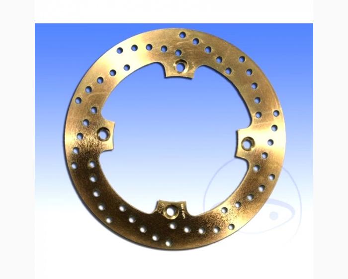 EBC MX Bremsscheibe für Offroad Motorräder. MADE IN UK. Ziel bei der Entwicklung ist die Verbesserung des Bremsverhaltens gegenüber der Originalbremsscheibe. EBC verwendet HPSR Stahl mit einem niedrigen Kohlenstoffgehalt, der einen um 18% höheren Reibbeiwert besitzt. Dieser Stahl ist wesentlich widerstandsfähiger gegen Rost als Gussstahl. Zusätzlich ist die gesamte Oberfläche mit einer 3 Mikron dicken Zinkschicht geschützt, die sich im Bereich der Bremsbelagkontaktzone schon beim Einbremsen abschleift. Lediglich in diesem Bereich kann sich leichter Flugrost bei längerer Standzeit bilden. Die Bremsscheiben sind im Vogelschwingendesign gebohrt, um mit so wenig Bohrungen wie möglich bei gleichzeitig optimierter Reinigung der Bremsscheibe von Regenwasser und Bremsstaub auszukommen. Je weniger Bohrungen angebracht sind, desto besser ist das Nassbremsverhalten und desto geringer ist der Verschleiß. - Starre Bremsscheibe. - Aus wärmebehandeltem Kohlenstoffstahl hergestellt. - Bremsfläche mit optimiertem Lochmuster gebohrt. - Radial geschliffen. - Verzinkt zum Schutz gegen Korrosion. - EBC empfiehlt EBC Organic TT Bremsklötze oder für sportliche Fahrer EBC Sinterbremsklötze in R oder MXS Mischung. - Eigenständiges Design. - Dicke der Bremsscheibe kann gegenüber dem Originalteil variieren. Preiseinheit: 1 Stück für Honda XRV 750 Africa Twin RD04 1990-1992 hinten Technische Daten: Außendurchmesser :   256 mm Innendurchmesser :   144.2 mm Lochkreis :   166 mm Anzahl der Bohrungen :   4 Bohrungsdurchmesser :   10.5 mm Stärke :   5 mm Ausführung :   starr Hersteller :   EBC